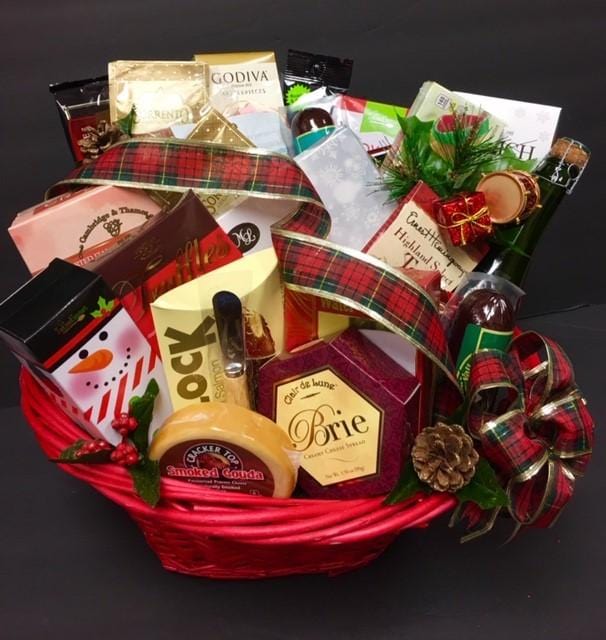 This magnificent large gift basket is abundantly filled with so many savories and confections that we do not have room to list them all. Highlights include gourmet gouda and brie cheese spread, smoked salmon, shortbread cookies, large bottle of cider, gourmet fruit spread, keepsake wood spreader. On the sweeter side chocolate covered pretzels, comfort Collection caramel popcorn, cookie snack pack, large box of Premium assorted chocolates, gourmet fruit slices, gourmet crackers, summer sausage, gourmet earl gray tea, Harry and David flavored coffee, French truffles, gourmet chocolate chip cookies, Ghirardelli chocolates and so much more. This basket will definitely leave them with a lasting impression. **Basket style may vary.