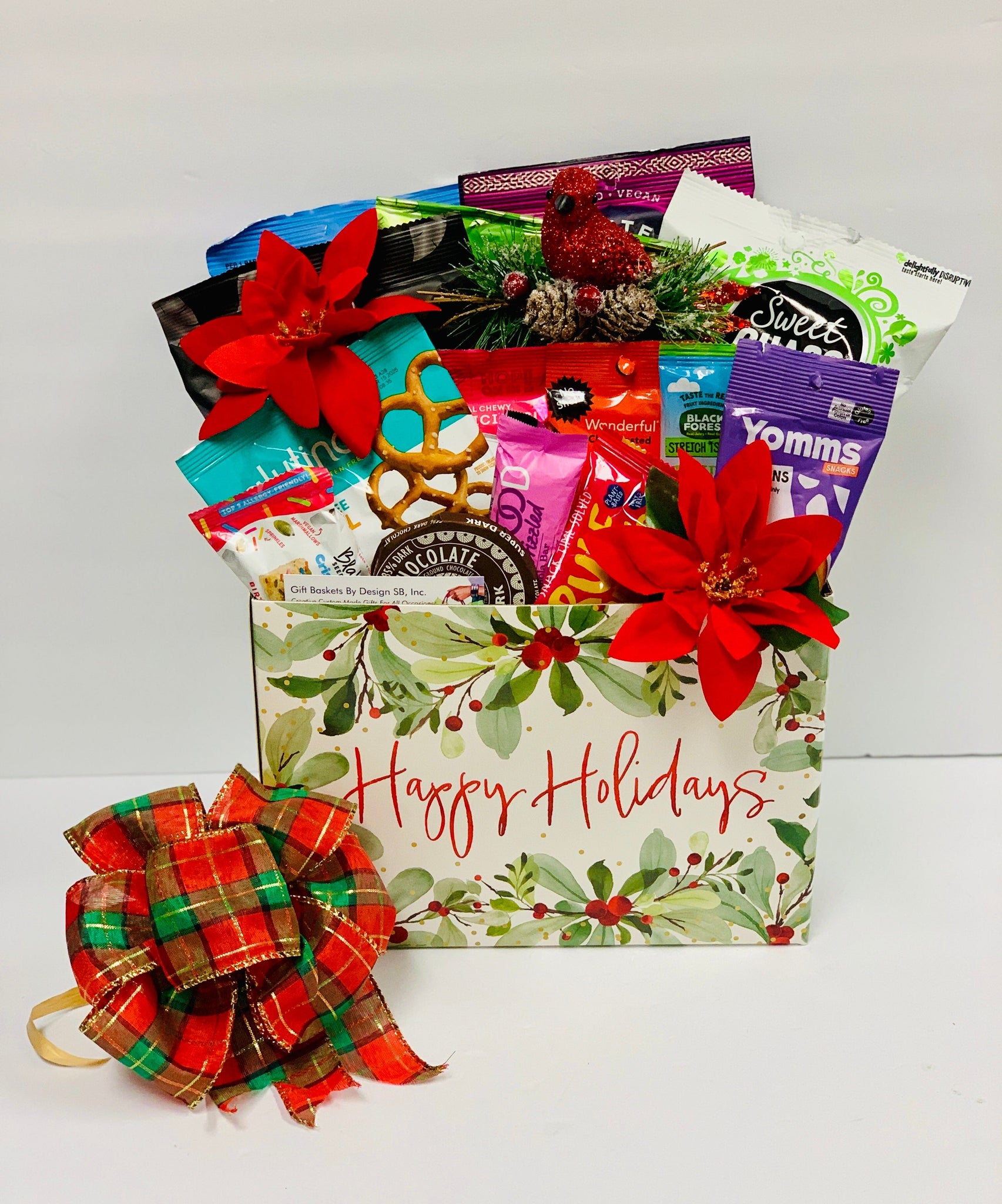 This large gift basket box is fully loaded with a large assortment of Vegan, Gluten Free, Gluten free dairy free and Gluten Free and Vegan products has it all from back to Natural freeze dries mix, pretzels, Plantain chips, gluten free bar and so much more all wrapped up with a handmade bow. Perfect for the holidays