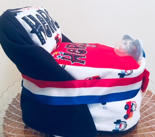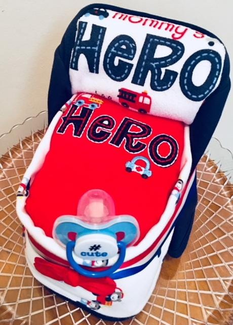 A cute original and unique baby Hero gift diaper bassinet it includes 12 # 2 baby diapers, 2 burp cloths, baby bib and a cute onesie outfit the perfect gift to send to the new baby boy or girl.