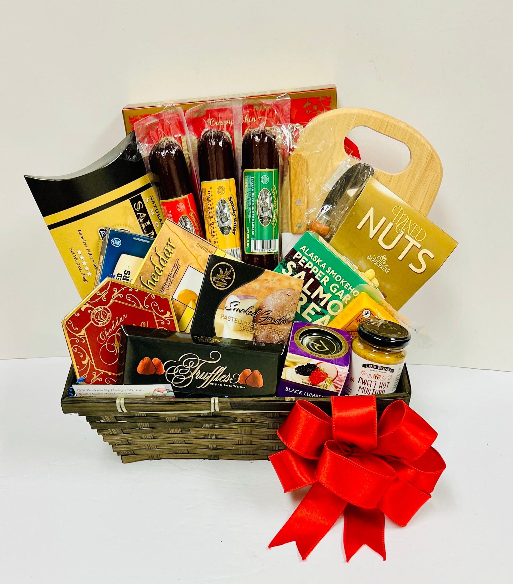 Has a lot more additional products such as - Caviar or lobster spread, Flavored Summer Sausage, Italian salami, Smoked Oysters, Smoked Salmon, and additional gourmet cheese such as peppercorn or Swiss wedges and gourmet crackers, additional Godiva chocolate assorted truffles and a keepsake cutting board.
