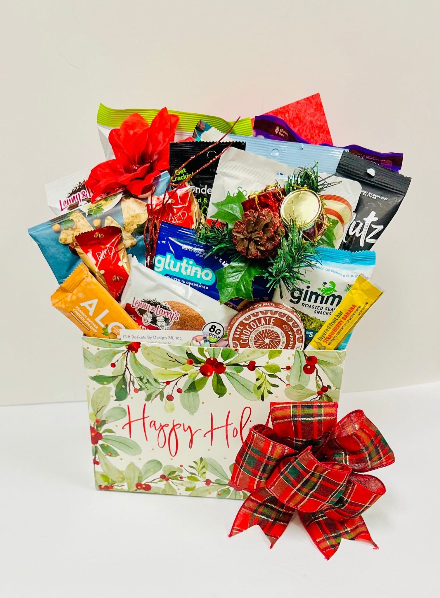 This large gift basket box is fully loaded with a large assortment of Vegan, Gluten Free, Gluten free dairy free and Gluten Free and Vegan products has it all from back to Natural freeze dries mix, pretzels, Plantain chips, gluten free bar and so much more all wrapped up with a handmade bow. Perfect for the holidays